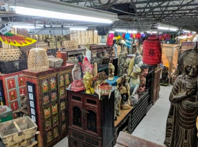 The breadth of the gallery’s inside is such that each time I enter, I have to take a minute to gather myself. A gracious, dark brown, wooden mandala hangs on an entire wall face off in a quiet corner. A collection of delicate, Tibetan jade bowls adorned with trademark silverwork sits translucently in a lit cabinet. Thousands of Buddhist and Hindu representations weigh down shelves that tower over my head. Antique wooden, Chinese bed chambers, bookcases, and cabinets stand crowded in the cavernous, rear warehouse. The owner’s daughter writes on their website that the gallery is in part her dad’s museum, and she is not wrong. The sight, smell, and feel of all of this soothes me, just as I become calm in Buddhist temples.